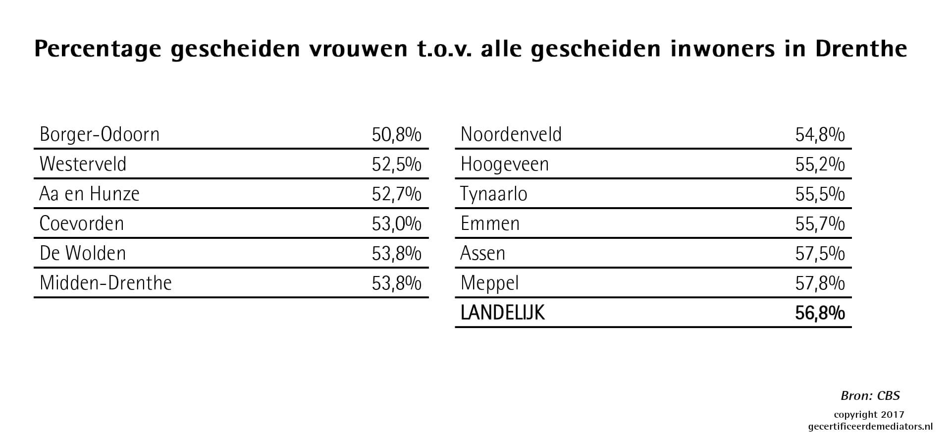 Doetinchem, 17 januari 2018 | Maar liefst 10 van de 12 Drentse gemeenten hebben een lager percentage gescheiden vrouwen dan het landelijke gemiddelde. Landelijk gezien is bijna 57 procent van de gescheiden inwoners vrouw; in Drenthe is dit slechts 55,19 procent. Dit blijkt uit onderzoek van de landelijke organisatie voor mediation Gecertificeerdemediators.nl, waarbij data van het CBS uit verschillende bestanden naast elkaar is gelegd.